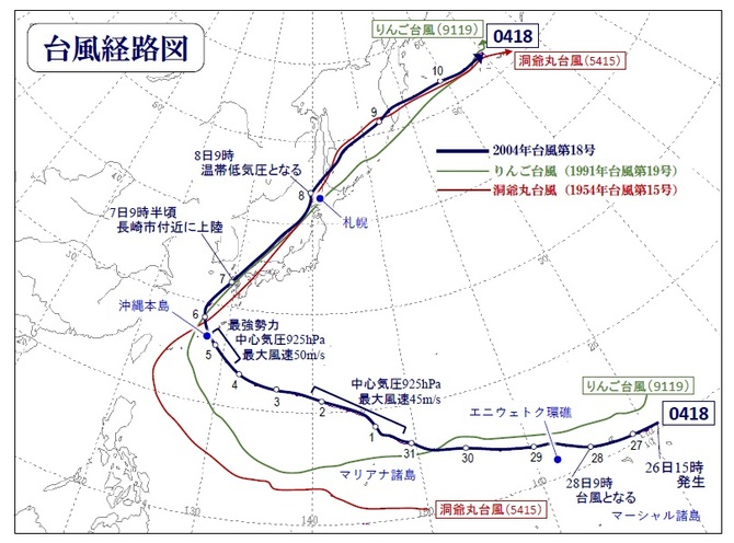 台風第0418号については、洞爺丸台風(1954年台風第15号)との類似も指摘される。図1に、洞爺丸台風の経路をレンガ色の細線で重ね書きして示した。洞爺丸台風は、鹿児島県に上陸する頃から急加速し、中国地方を通過して日本海へ進む頃のスピードは時速約100キロメートルに達し、あっという間に津軽海峡西方に進んで急減速した。そして、運命の青函連絡船洞爺丸の事故が起きた。洞爺丸台風が鹿児島県に上陸した頃の中心気圧は970ヘクトパスカル(当時は気圧の単位としてミリバールを使用していた)くらいで、後年の「りんご台風」や台風第0418号の上陸時の勢力より弱かったが、上陸後に中心気圧が下がり続け、日本海を進みながらさらに深まり、北海道西岸へ進んだ時には952ヘクトパスカルに達し、生涯を通じての最強勢力を示すに至った。この発達は、もちろん台風が温帯低気圧に変化する過程での出来事であるが、当時はそうした現象に関する知識が乏しく、異常発達として受け止められた。
