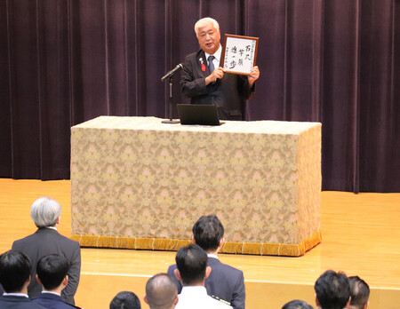 〔写真説明〕防衛装備庁の創立10周年行事で訓示する中谷元防衛相=1日午後、防衛省