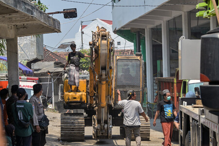 〔写真説明〕3日、インドネシア・東ジャワ州スラバヤ近郊の学校倒壊事故現場に投入されるショベルカー(AFP時事)