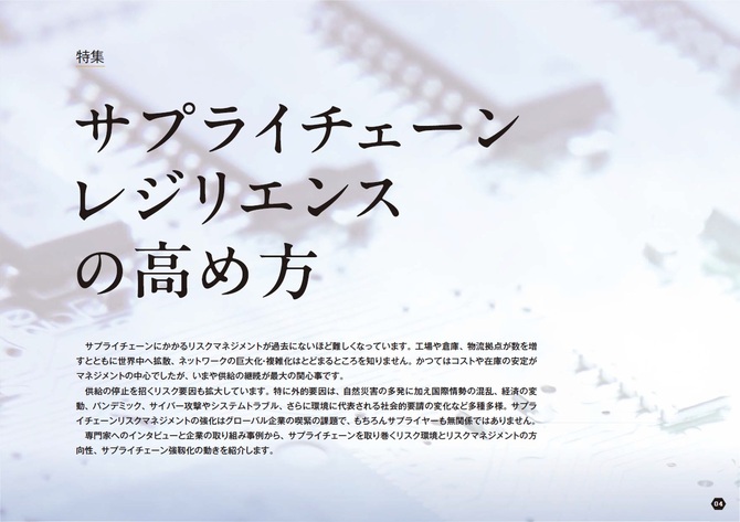 専門家へのインタビューと企業の取り組み事例から、サプライチェーンを取り巻くリスク環境とリスクマネジメントの方向性、サプライチェーン強靱化の動きを紹介します。