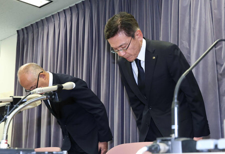 〔写真説明〕田園都市線梶が谷駅で起きた衝突脱線事故を受け、記者会見で頭を下げる東急電鉄の福田誠一社長(右)ら=7日午後、東京・霞が関