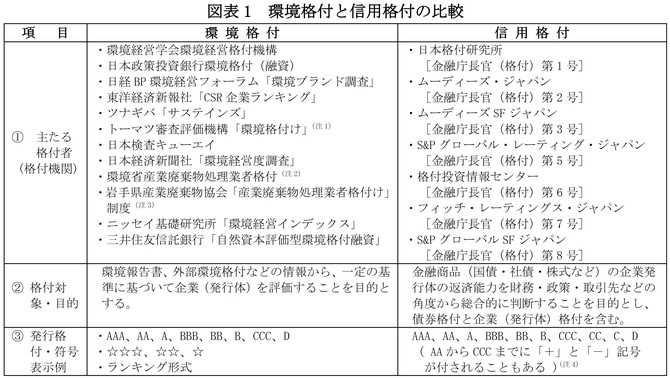 近年、環境経営を評価する手法として、「環境格付」が浸透しています。環境格付は「CSR (Corporate Social Resposibility )格付」または「サスティナビリティ格付」とも呼ばれています。環境格付は、「企業の環境経営における3つのボトムライン―自然・社会・経済―を押さえて、企業の環境サスティナビリティ維持と環境保全の実現に対する度合い(環境サスティナビリティ貢献性)を基軸として企業の全活動を評価・分類する」と定義されています。わが国の主な環境格付と一般的な信用格付を比較しますと、図表1のとおりです。