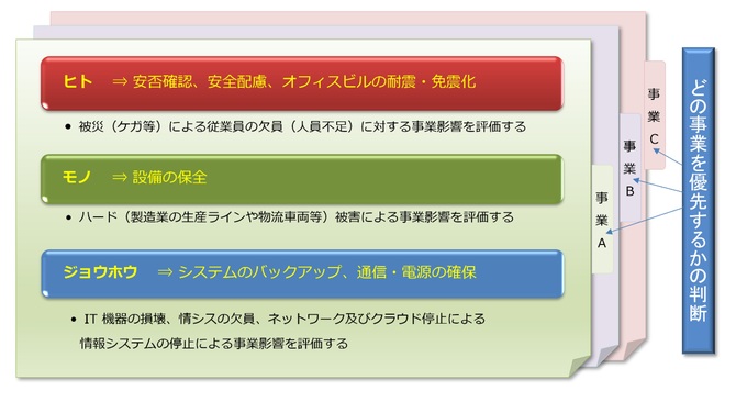 企業リソース視点として、それぞれのリソースの被災状況を結果ベースとして捉え、その際の事業影響度を分析・評価し、対応策を講じるものです。