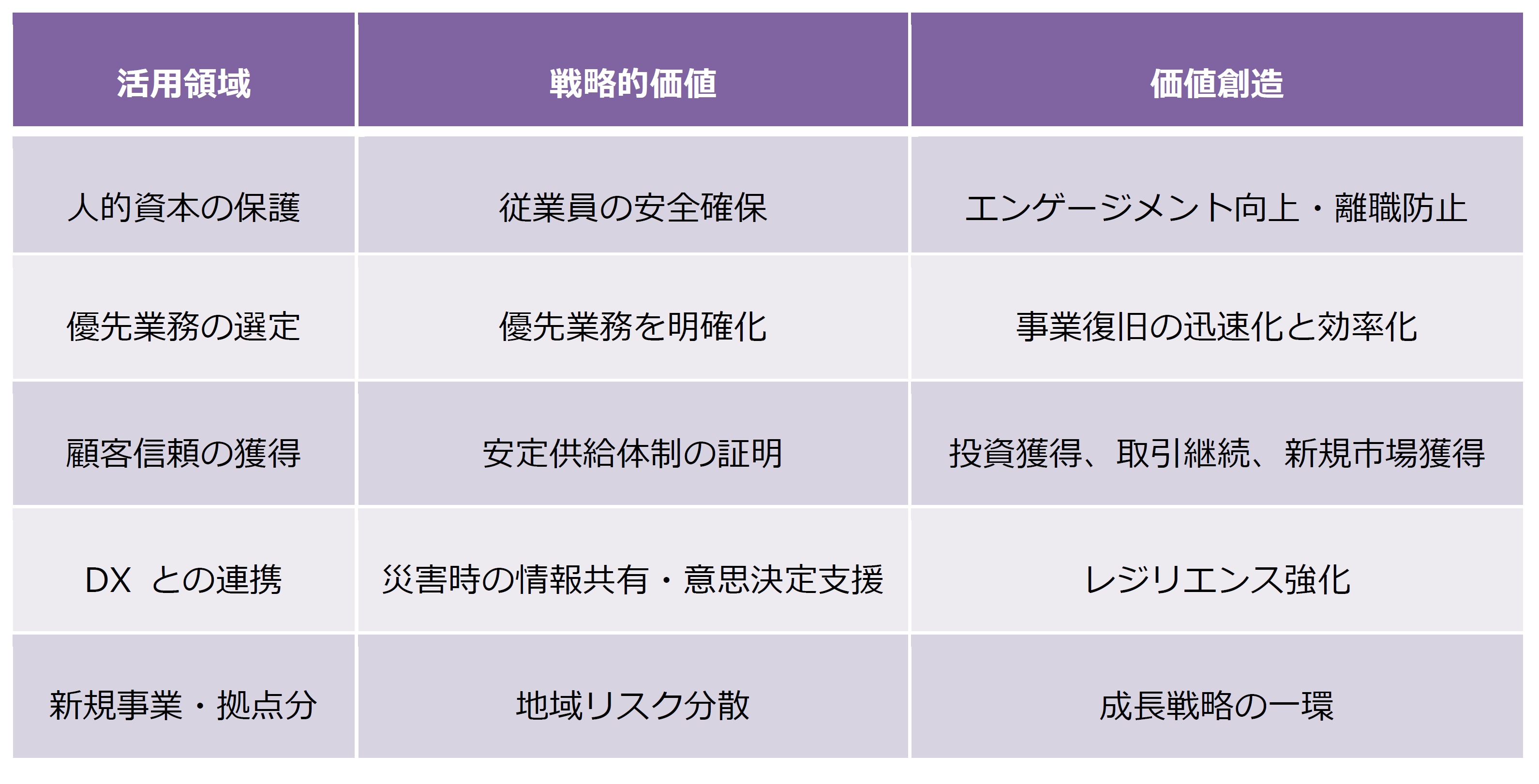 前々回の寄稿で、危機管理・BCPは、リスクマネジメントとしての「守り」から、企業戦略としての「攻め」にシフトしていると申し上げました。上場企業にとって、危機管理・BCPは「サスティナビリティ」の一環であり、以下の表に示されるように、価値創造の領域として、その重要性を増しています。