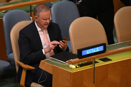 〔写真説明〕携帯電話を操作するオーストラリアのアルバニージー首相=9月22日、ニューヨーク(EPA時事)