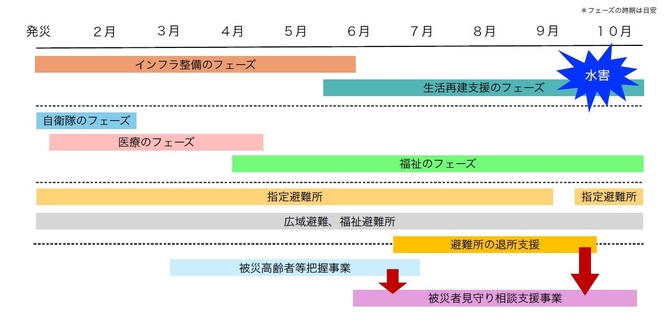 そこで私は、さまざまな専門家の方々からお話を伺いながら、自分なりに災害支援のスケジュールを整理してみました。大きく分けると、災害支援には2つのフェーズがあると考えています。一つは「インフラ整備のフェーズ」、もう一つは「生活再建支援のフェーズ」です。