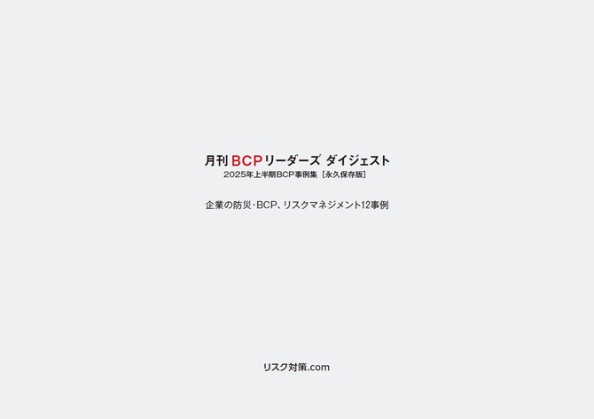 リスク対策.comは「月刊BCPリーダーズダイジェスト2025年上半期事例集」を発行しました。防災・BCP、リスクマネジメントに取り組む12社の事例を紹介しています。危機管理の実践イメージをつかむため、また昨今のリスク対策の動向をつかむための情報源としてお役立てください。