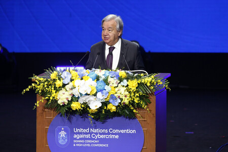 【ハノイ時事】ベトナムの首都ハノイで25日、国連で2024年に採択されたサイバー犯罪条約の署名式が開かれた。ベトナム側によると70カ国近くが署名したという。条約は40カ国が国内手続きを経て批准した後に発効する。国連のグテレス事務総長も出席した。