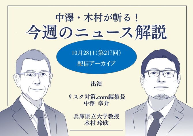 リスク対策.com編集長が、その週で最も注目するニュースを解説! 時事ネタに加え、リスク対策.comの特集や連載の中から、危機管理に携わる読者の皆様にぜひ知ってほしい記事を取り上げ、背景にある社会情勢や関連する動きなどを、独自視点で斬り込みます。パーソナリティは、心理学・危機管理学専門の兵庫県立大学教授の木村玲欧氏。
