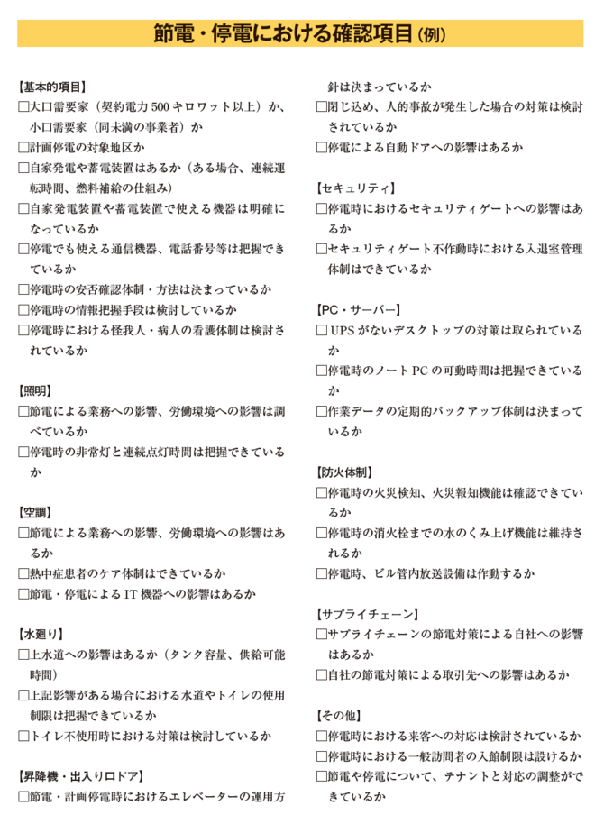 企業は節電による労働環境やIT・システムへの影響、資金面への影響、さらにはサプライチェーンへの影響など全社的にリスクを洗い出した上で、節電対策を考える必要がある。また、仮に計画停電が行われた場合や、大規模停電が起きた際の業務継続計画についても、それぞれ対応を考えておくことが求められる。
