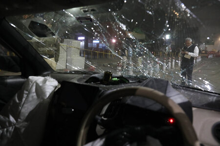 〔写真説明〕割れたフロントガラス=10日、ニューデリー(EPA時事)