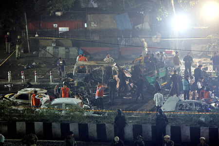 〔写真説明〕車が爆発した現場を調べるインド警察=10日、ニューデリー(EPA時事)
