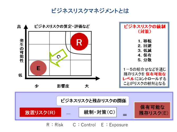 第2回コラムでビジネスリスクマネジメントに関し、以下の図で説明をしました。何の対応をとらない時の「放置リスク」を自社の許容範囲まで低減・管理する事にビジネスリスクマネジメントの目的があります。