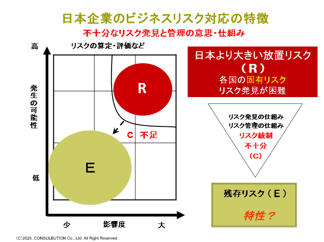 海外事業は、グローバルサウスにみられるような成長する海外市場での事業展開が期待できる一方、日本とは異なる大きな放置リスクがあります。日本企業は日本においても「性善説」に基づき、統制・対策(C)が弱い経営管理に特徴がありますが、海外においては、この特徴が日本以上に経営リスクを増大化させることに繋がります。