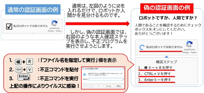 ・認証画面を装って、パソコンなどの利用者に不正な入力を誘導し、ウイルスに感染させる手口です。