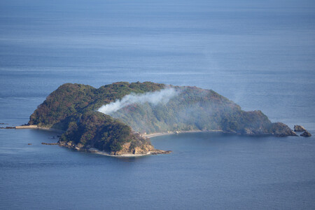〔写真説明〕大規模火災が発生した佐賀関漁港沖合の無人島から上がる煙=19日午後、大分市