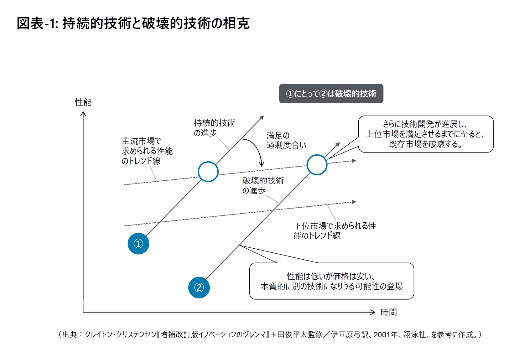 クリステンセンは、破壊的イノベーションの特徴を、技術的には単純で、既成の部品を使い、アーキテクチャーも従来のものより単純な場合がある、と説明する。そのため、破壊的イノベーションは確立された市場では顧客の要望に応えるものではなく、当初はほとんど採用されない、主流からかけ離れた、さほど重要視されない新しい市場 ( 下位市場 ) でしか評価されないものであるという。それをイメージで描くなら、図表-1のとおりである。
