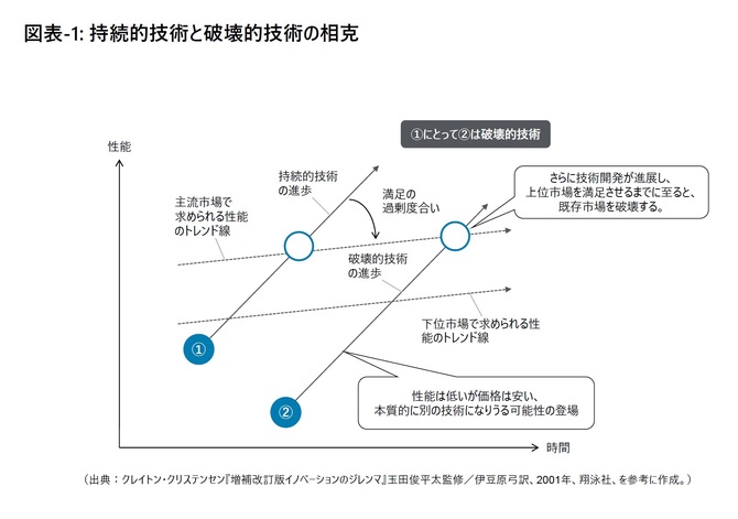 *1 これは、既存の市場で求められる価値を低下させつつ、新しい価値基準を市場にもたらすイノベーションのことを意味する。ハーバード・ビジネススクールのクレイトン・M・クリステンセン教授が『イノベーションのジレンマ』の中で提唱した概念である。「持続的イノベーション」の対義語にあたる。