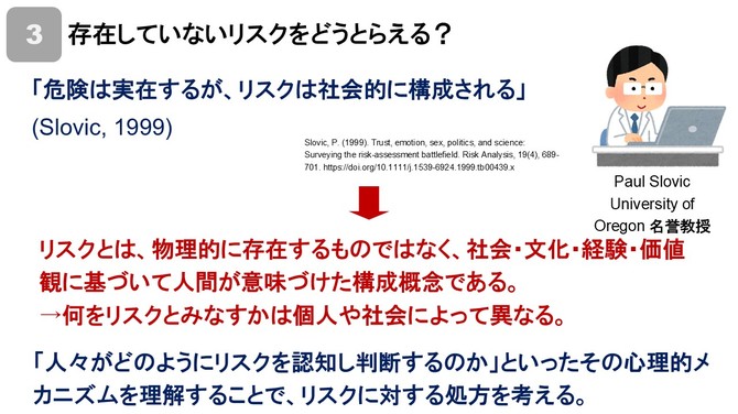 大友氏は、健康問題などにおける人々のリスクに対する考え方を紹介した上で、オレゴン大学名誉教授のポール・ソルビック氏の言葉を用いて「危険は実在するけれど、何をもってリスクっていうのは、実は社会によって異なると捉えられている。リスクとは、物理的に存在するものではなくて、社会であったり、文化であったり、経験価値観に基づいて人間が意味付けたいわゆる考えられた概念」と説明しました。
