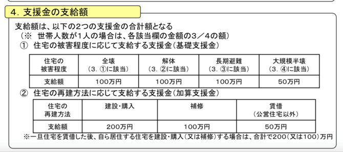 体が動かせなくなった、職を失ったなど、家は無事だが地盤が住める状態ではないなど被災の状況は様々であるのに、現行法の支援金は、家の損壊具合だけが基準になっている、そのこと事態が問題を引き起こしているのでは?という考え方です。