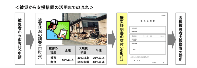 り災証明とは、被災者から申請があったときは、被害状況を調査し市町村長が発行するものです。