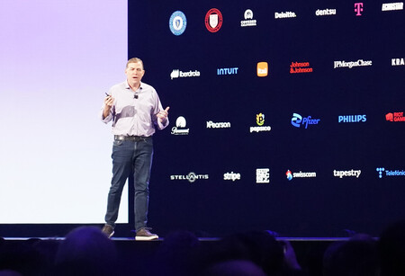 〔写真説明〕2日、米ラスベガスで開かれた技術イベントで基調講演するアマゾン・ウェブ・サービス(AWS)の責任者マット・ガーマン氏