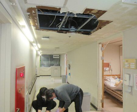 むつ総合病院は下北地域では唯一の総合病院で、地域医療の中核的な役割を担っている。8日深夜の地震で7階天井に取り付けられたスプリンクラーが故障。水が漏れて入院病棟の5~7階が水浸しになり、ベッドが使えなくなった。7階の床に水が染み込み、6階の天井が一部抜け落ちた。