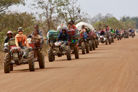 〔写真説明〕10日、カンボジア北部ウッドーミアンチェイ州で避難する人々(EPA時事)