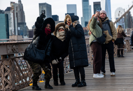 〔写真説明〕米ニューヨークのブルックリン橋で、写真を撮る人たち=8日(AFP時事)