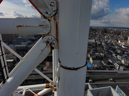 〔写真説明〕損傷した、NTT青森八戸ビルに設置されている鉄塔の柱(NTT東日本提供)