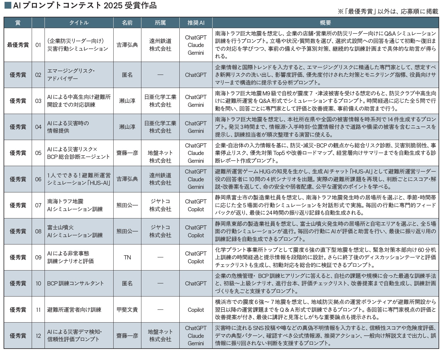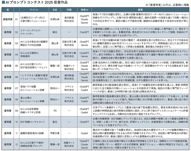 リスク対策.comは、防災・BCP 分野における生成AI 活用を一段進めることを目的に「実務でそのまま使えるプロンプト」を読者から募集するコンテストを実施した。応募期間は11 月11〜21 日の10日間。短期間にもかかわらず14件の応募が寄せられ、リスク対策.com編集部による審査の結果、同順を含む12 件を優秀作として選定し、その中から最優秀賞(大賞)1 件を決定した。