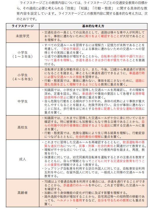 教育目標は心身の発達、自転車の利用実態、交通事故実態を踏まえ、例えば成人なら、飲酒運転など悪質な違反について「民事・刑事・社会的責任と関連付けて教育する」といった考え方が示された。