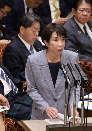 〔写真説明〕参院予算委員会で答弁する高市早苗首相(手前)=12日、国会内