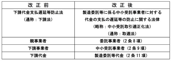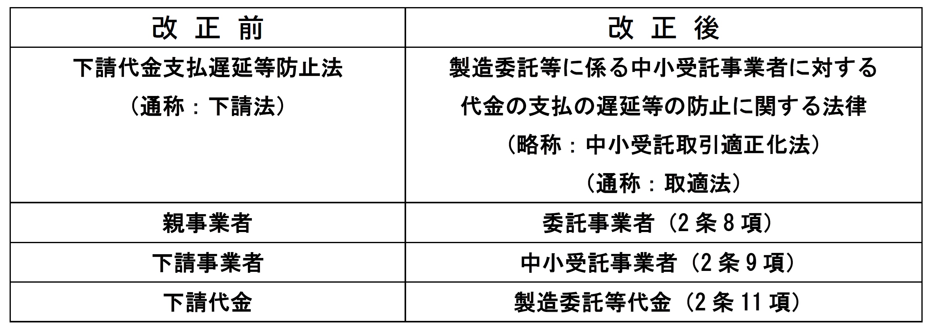 近時、下請という言葉は、契約当事者間の対等な関係を前提としておらず、上下関係を前提としているものと捉えられ、事業者の中には、下請という用語を用いずに、パートナーなどと呼ぶようになっている状況がありました。下請法でも、下表のとおり、法律名称も含め用語が改められることになりました。