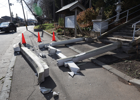 〔写真説明〕地震の影響で倒壊した神社の鳥居=9日、青森県八戸市