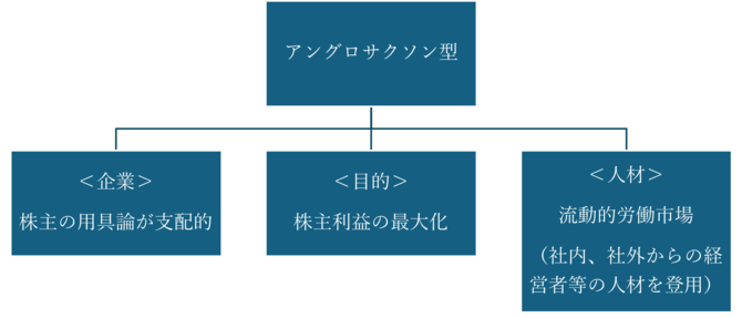 「アングロサクソン型コーポレートガバナンス」のガバナンスの目的は、株主利益の最大化にあります。企業は株主の利益最大化のための用具と捉えられ、その目的のために働く経営陣・管理者を株主が流動性のある市場からリクルートし、選任後に間接統治をします。アメリカ、英国がその代表的な国になります。
