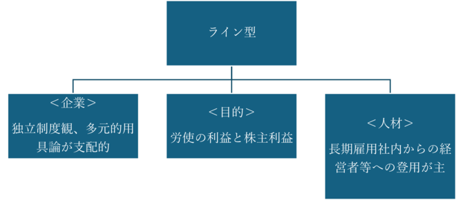 一方、「ライン型コーポレートガバナンス」とよばれる企業統治の典型はドイツにあります。ドイツには、企業それ自体で存在意義を持つ社会制度であるという独立制度観、あるいは企業は労使の共同統治の制度であるという多元的用具観が色濃くあります。従って、株主だけではなく、労使や利害関係者の利益の最大化がコーポレートガバナンスの目的になります。ドイツ、フランス等が「ライン型コーポレートガバナンス」の代表的な国になります。