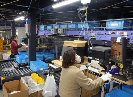 〔写真説明〕アスクルの物流センターで、発送する商品を仕分けするスタッフ=17日、東京都江戸川区