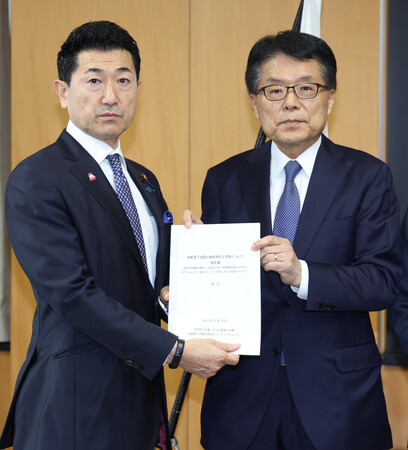 〔写真説明〕中央防災会議作業部会の増田寛也氏(右)から首都直下地震に関する報告書を受け取る赤間二郎防災担当相(左)=19日午前、東京都千代田区