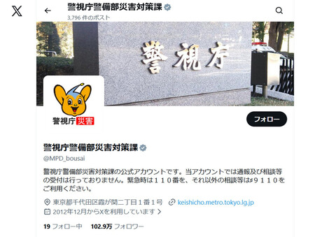 〔写真説明〕警視庁災害対策課のX(旧ツイッター)アカウント