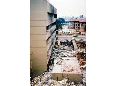 1983年4月18日、レバノンの首都ベイルートのアメリカ大使館で爆弾を積んだワゴン車が暴走、玄関ドアを突き破って爆発しました。この爆発でアメリカ人を含む63人が死亡、120人が負傷しています。同年10月23日、ベイルートのアメリカ海兵隊の現地司令本部があったベイルート国際空港にもワゴン車が突入し爆発、241人が死亡、その数分後にはフランス空挺隊基地にもワゴン車が突入し爆発、297人が死亡しました。1998年8月7日にはケニアの首都タンザニアのアメリカ大使館に爆弾を積んだトラックが突入し爆発、291人が死亡(写真2)、また同日同時刻にタンザニアの首都ダルエスサラームのアメリカ大使館も同様にトラック爆弾により10人が死亡しています。