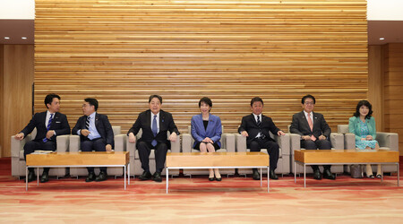 〔写真説明〕閣議に臨む高市早苗首相(中央)=23日午前、首相官邸