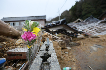 〔写真説明〕能登半島地震で倒壊した家屋の前に供えられた花束=1月1日、石川県珠洲市