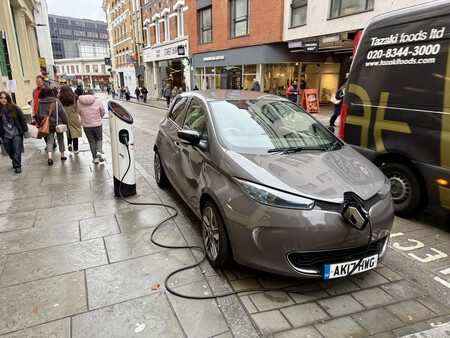 〔写真説明〕ロンドン中心部で充電中の電気自動車=1日