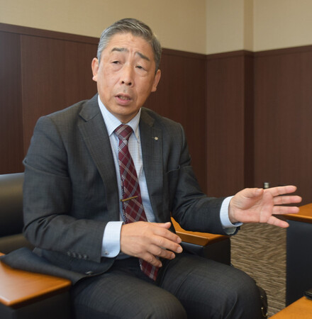 〔写真説明〕取材に応じる興能信用金庫の田代克弘理事長=2025年12月15日、金沢市