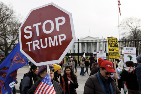 〔写真説明〕米ホワイトハウス前でトランプ政権のベネズエラ攻撃に抗議するデモの参加者ら=3日、ワシントン(EPA時事)