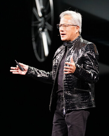 〔写真説明〕米家電・IT見本市「CES」の開幕を前に講演する米半導体大手エヌビディアのフアン最高経営責任者(CEO)=5日、米ラスベガス
