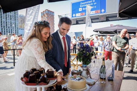 〔写真説明〕ウェディングケーキにナイフを入れるオランダの新婚カップル(AFP時事)(記事と写真は関係ありません)