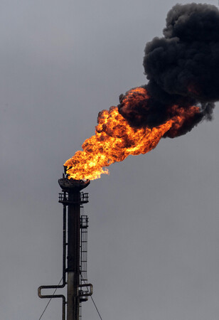 〔写真説明〕ベネズエラ国営石油会社PDVSAの製油所の煙突=2021年11月、北部プエルトラクルス(AFP時事)