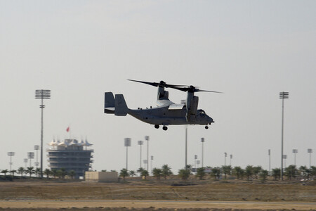 〔写真説明〕バーレーンのサヒール空軍基地で飛行する米海兵隊の輸送機V22オスプレイ=2018年11月(AFP時事)